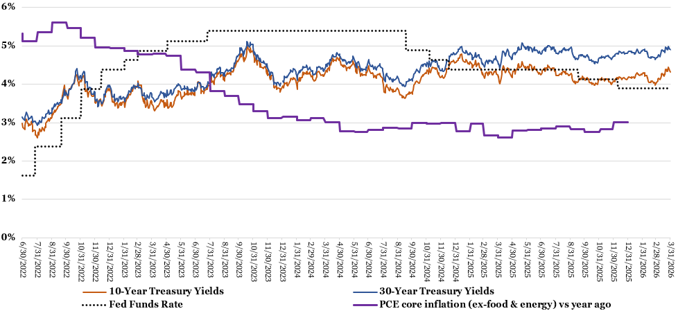 Sources: St. Louis Fed/Board of Governors of the Federal Reserve System. https://fred.stlouisfed.org/series/DGS10 (10-year US Treasury yield). https://fred.stlouisfed.org/series/DGS30 (30-year US Treasury yield) https://fred.stlouisfed.org/series/PCEPILFE (PCE inflation ex-food & energy). Forbes Advisor. https://www.forbes.com/advisor/investing/fed-funds-rate-history/ (Fed Funds rate).