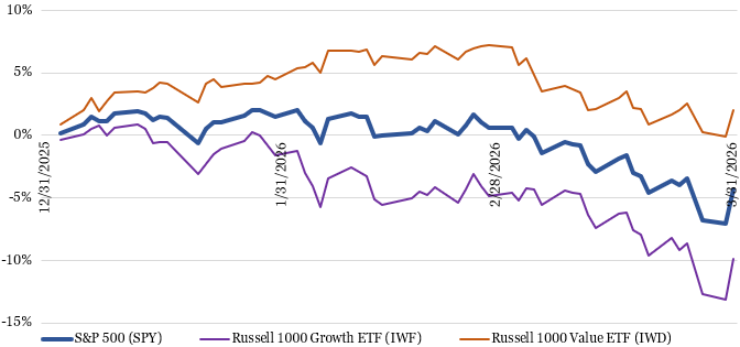 Figure 1: Markets Plunged in March as Iran War Begun, Especially Growth Stocks