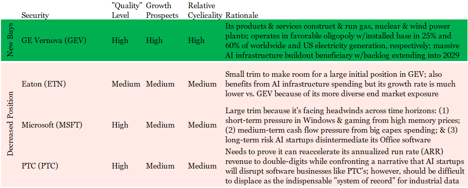 Portfolio activity was moderate in the first quarter. The biggest change was buying a good-sized position in GE Vernova (GEV), an energy equipment manufacturer that is a prime beneficiary from the AI buildout’s power needs. The new position, purchased on February 23rd at ~$820/share, was funded by selling a good chunk of our high weighting in Microsoft (MSFT) and taking modest trims to our medium weighting in Eaton (ETN) and small weighting in PTC (PTC). For clients with silver holdings, I methodically trimmed their Physical Silver Shares ETF (SIVR) during silver’s parabolic move higher in January.