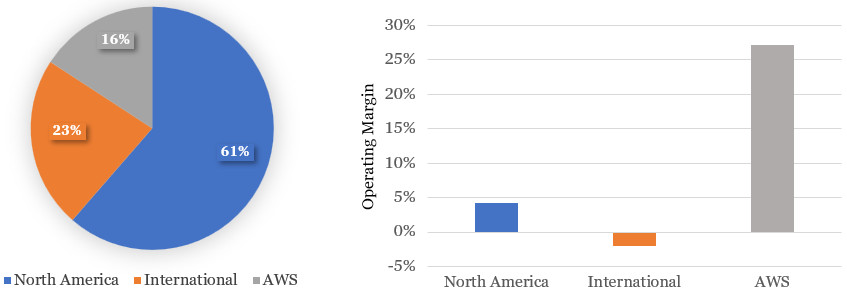 Amazon reports its results through three segments – North America, International, and AWS. The North America and International segments house all its businesses outside of AWS. Segment revenue and profitability metrics are below.
