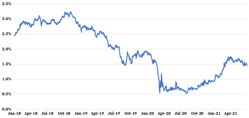 My baseline expectation is for the 10-year treasury yield to work back towards its year-to-date high in the 1.75% range as near-term inflation could surprise to the upside and as the bond market better anticipates the Fed becoming less accommodative. I see roughly equal likelihood between yields piercing 2% later this year and yields remaining just under 1.5%.