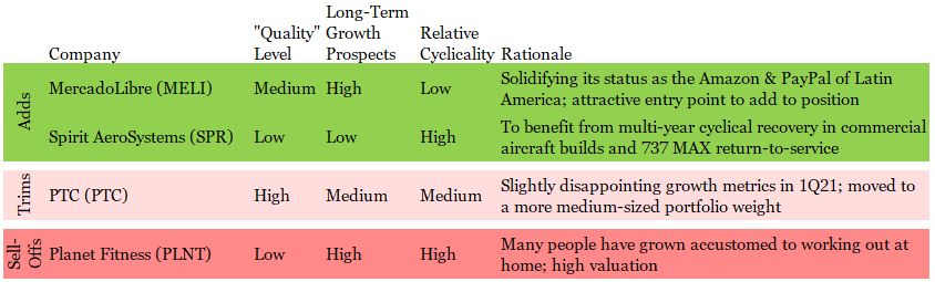 Indeed, I continue to invest over 80% of clients’ equity allocations in companies I would characterize as quality growth. The remainder of clients’ portfolios continue to be invested in lower quality, highly cyclical companies that should more fully benefit from an ongoing economic reopening. Many of our “quality growth” companies have above-average cyclicality, so they stand to disproportionately benefit from a resurgent economy too. Overall, clients should expect their equity portfolio to do best versus the market when growth outperforms value.