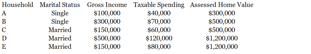 I looked at five hypothetical affluent households that are representative of my typical client and prospect profile to better gauge states’ total taxation. The households are meant to capture how varying income, spending, home values, and marital status can make certain states tax-advantageous for some people, but less so for others. Note that I am only incorporating spending on items subject to sales taxes, so mortgage payments, HOA dues, student loan payments and the like are excluded. Households A through D represent people in their working years, while E envisions a typical retiree couple drawing down their retirement accounts.