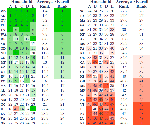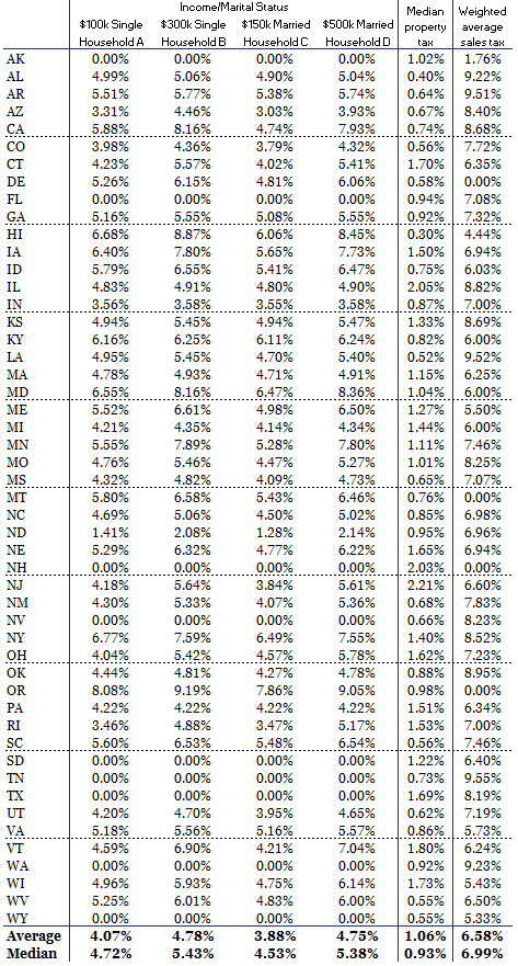 Meanwhile, it may be of little surprise that New York scored the worst. The Empire State is among the seven most taxing states for income taxes, ranks 37th for property taxes, and 41st for sales taxes. Iowa, New Jersey, Illinois, and Vermont round out the bottom five. Check out the Appendix to see the prevailing state tax rates for each household.