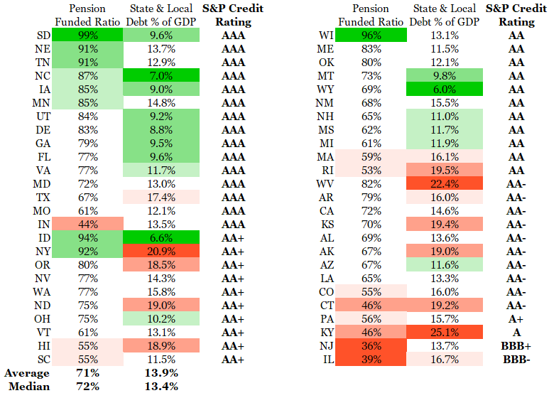 For those expecting to live in a state for many years, it is also prudent to consider the state’s financial health to gauge whether citizens’ overall tax burdens will worsen over time. Three indicators to help us assess this likelihood are the state’s pension funded level, debt as a percentage of GDP, and credit ratings. States with low pension funded ratios and/or high debt levels are more likely to eventually seek to raise additional revenue to appease pension beneficiaries and/or maintain healthy solvency. Further, states may wish to optimize their credit rating to secure needed funding at acceptable interest rates, often through tax hikes.