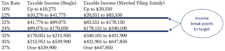Executing the Roth conversion is not an all-or-nothing proposition. The optimal strategy is to convert up to the point at which the next converted dollar (inclusive of all other taxable income) is taxed at a rate no greater than your estimated marginal tax rate at retirement. A couple break points stand out in today’s tax code – the demarcations between the 12% and 22% tax rates and the 24% and 32% tax rates. It is usually ill-advised to execute Roth conversions if have breached the 32% tax bracket because of the reduced likelihood of having a marginal tax rate that high at retirement.