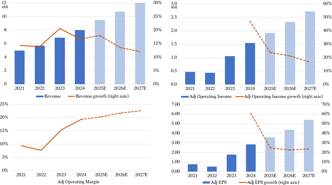 Over the next five years, I expect low- to mid-teens average revenue growth, one to two percentage points of annual margin expansion, and lower interest expense from debt paydowns to catalyze low 20s percentage average EPS growth.